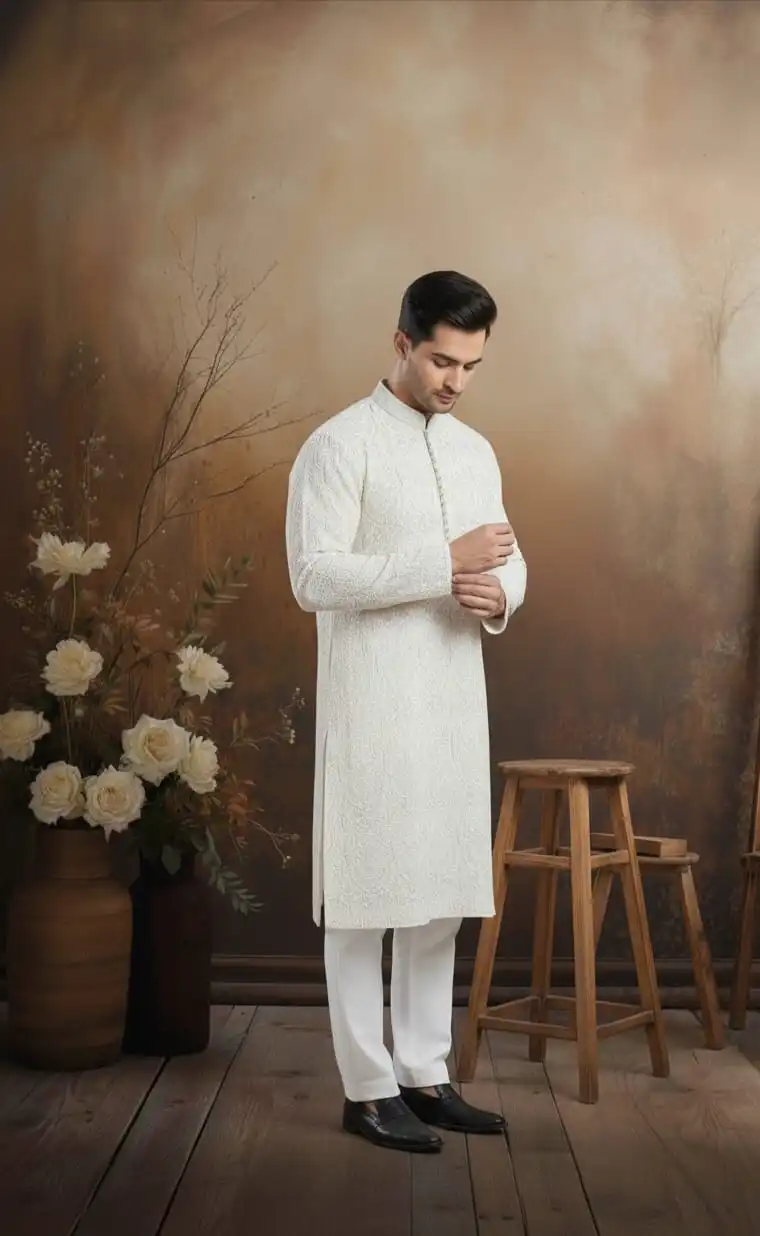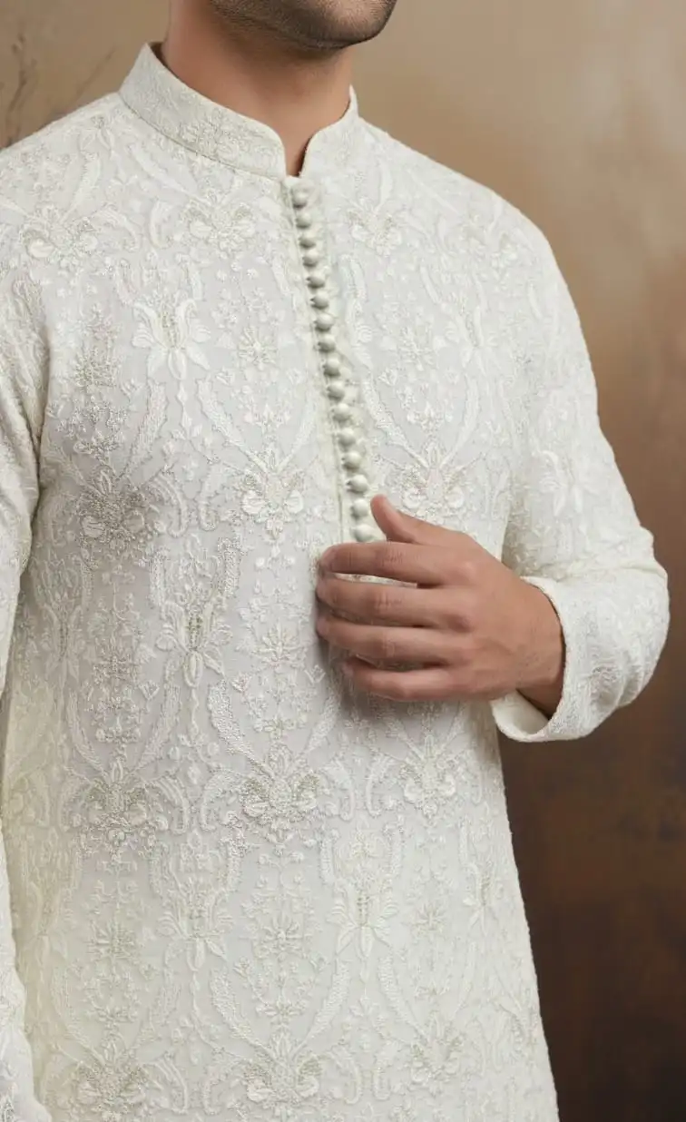 An elegant Kurta pajama with silk lining for Men featuring intricate cutwork detailing and premium tailoring. Perfect for formal events, festive occasions, and weddings.