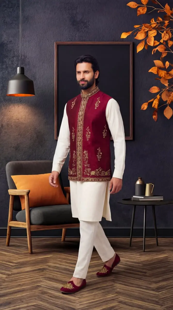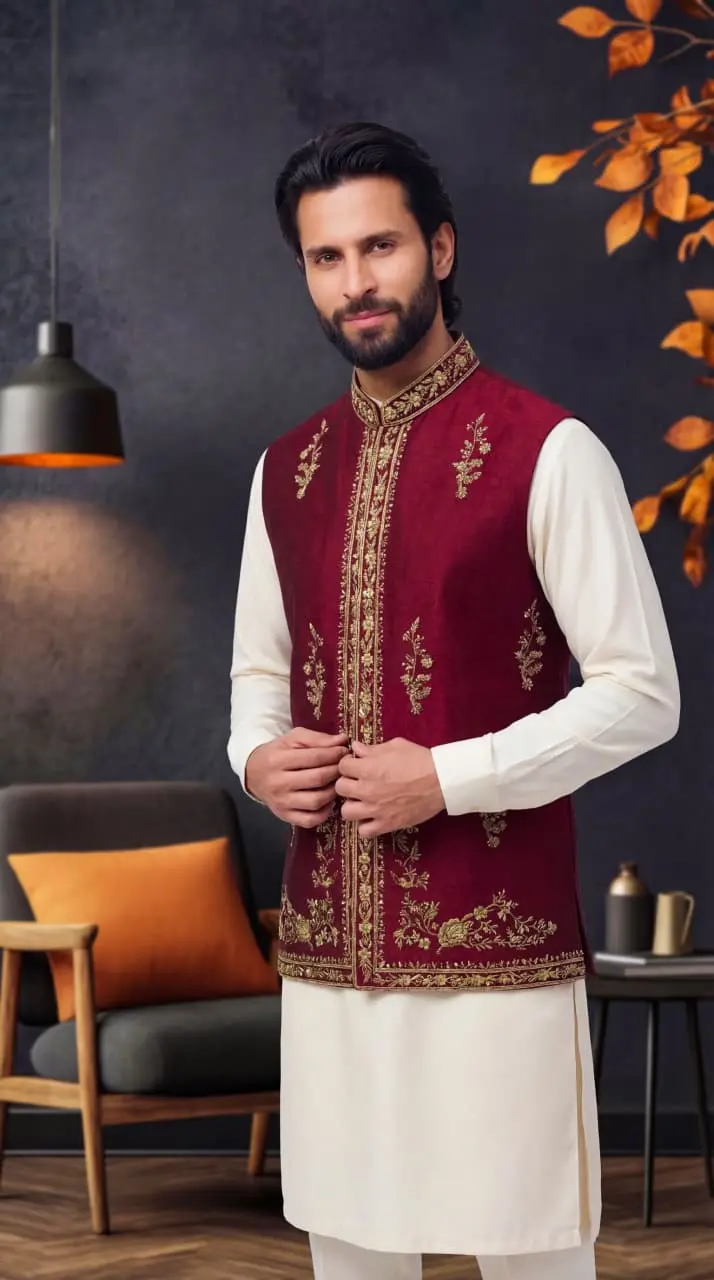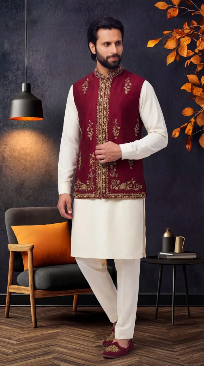 This Maroon Jacquard Waistcoat with Handmade Embroidery that adds a touch of sophistication and traditional craftsmanship. The deep maroon color gives it a royal and luxurious feel, making it a perfect choice for grooms and special events.