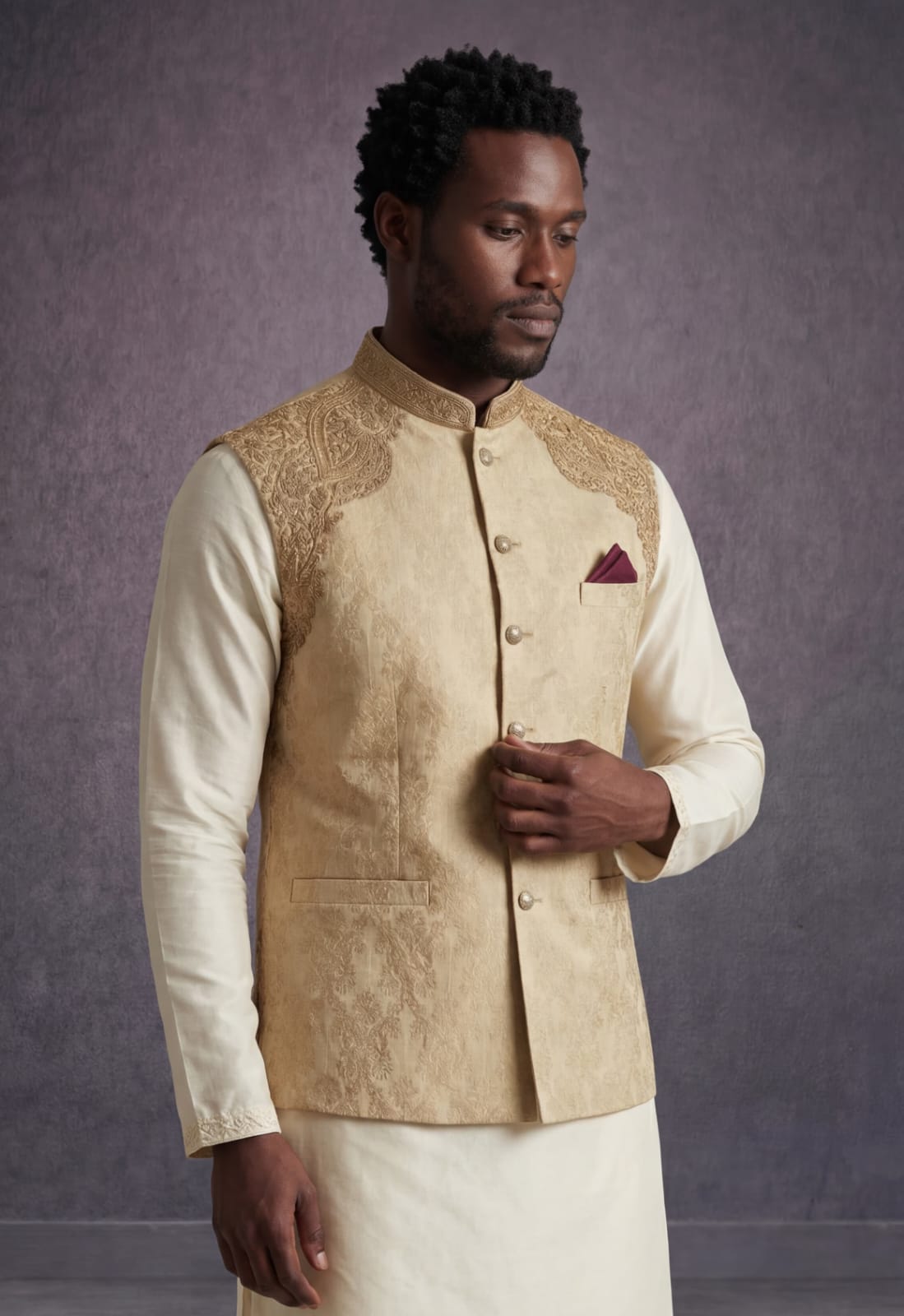 This waistcoat is not just a garment; it’s a work of art. It features intricate handmade embroidery along the collar and shoulders, meticulously detailed by expert artisans. The handmade buttons add a bespoke, high-end finish that sets this piece apart from mass-produced alternatives.