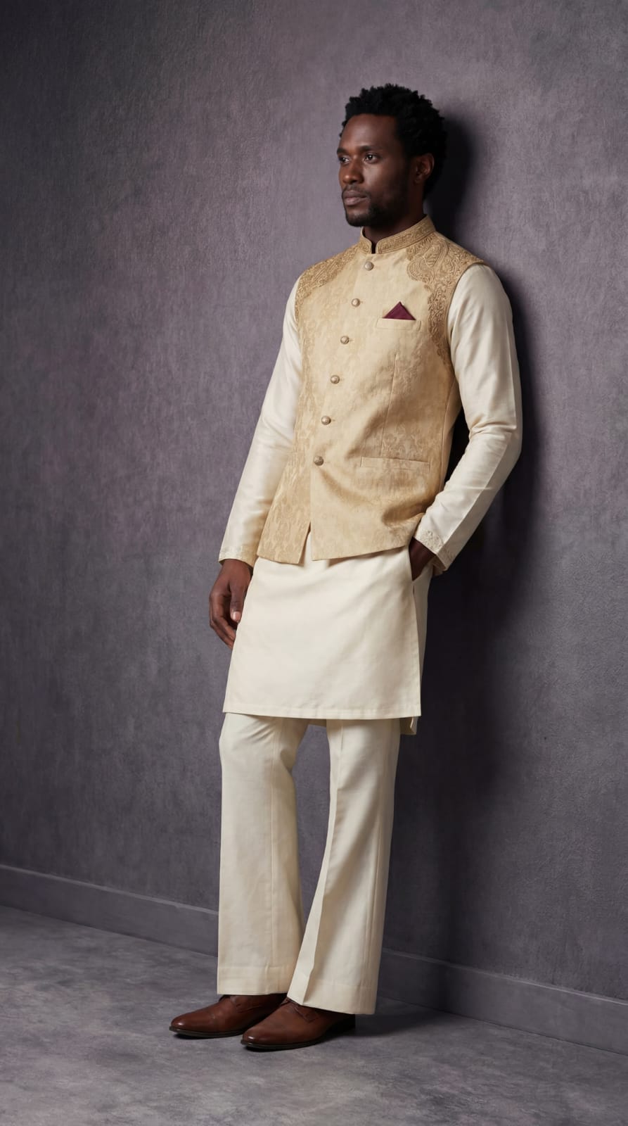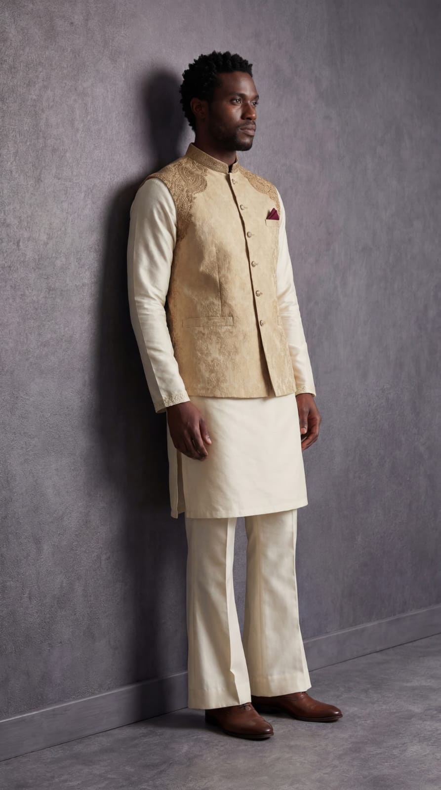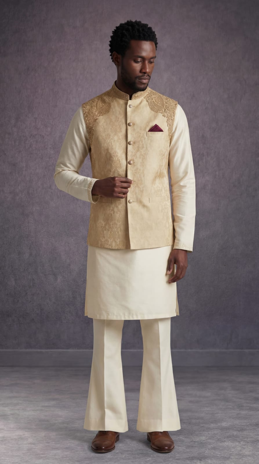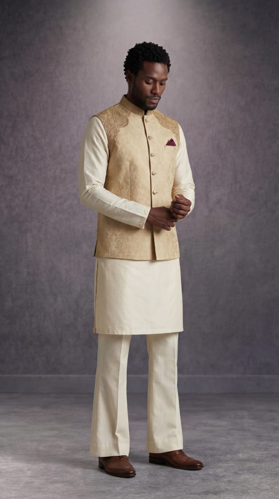 Constructed from high-quality Jamawar fabric, the waistcoat offers a rich texture and a subtle sheen that glows under event lighting. The sophisticated skin tone makes it a versatile choice, pairing perfectly with white, cream, or dark-toned Kurta Shalwar.