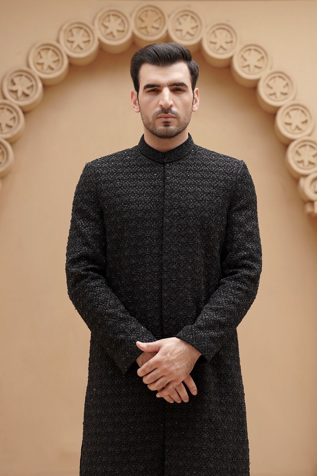 For the groom who defines his own style with confidence and authority, this Black Sherwani is your sartorial command. Black transcends trend, representing strength, sophistication, and timeless elegance. This piece is engineered for the modern leader—the groom who approaches his wedding not just as a celebration, but as the defining moment of his new chapter. It is as powerful under the lights of a grand Lahore ballroom as it is in a refined European castle setting.