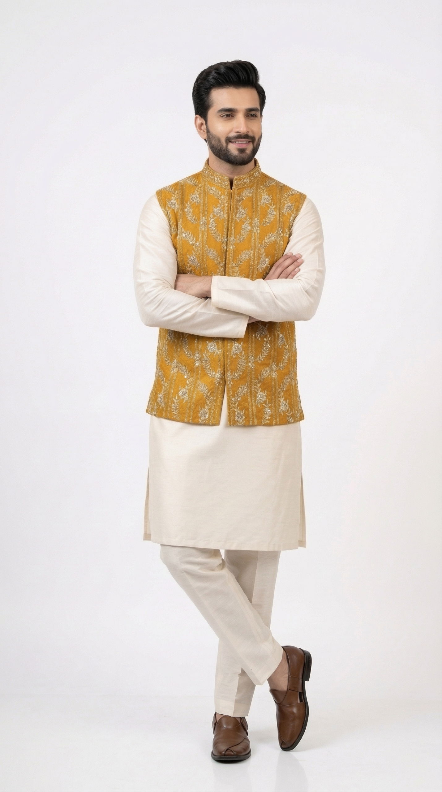 Mustard Embroidered Waistcoat for Men | Elegant Wedding Wear 2026