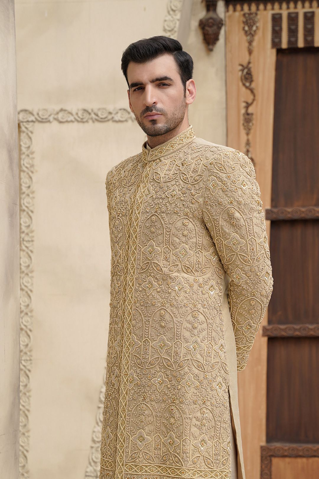 Elevate your traditional look with our Designer Golden Silk Sherwani – a timeless piece crafted for sophistication and class.